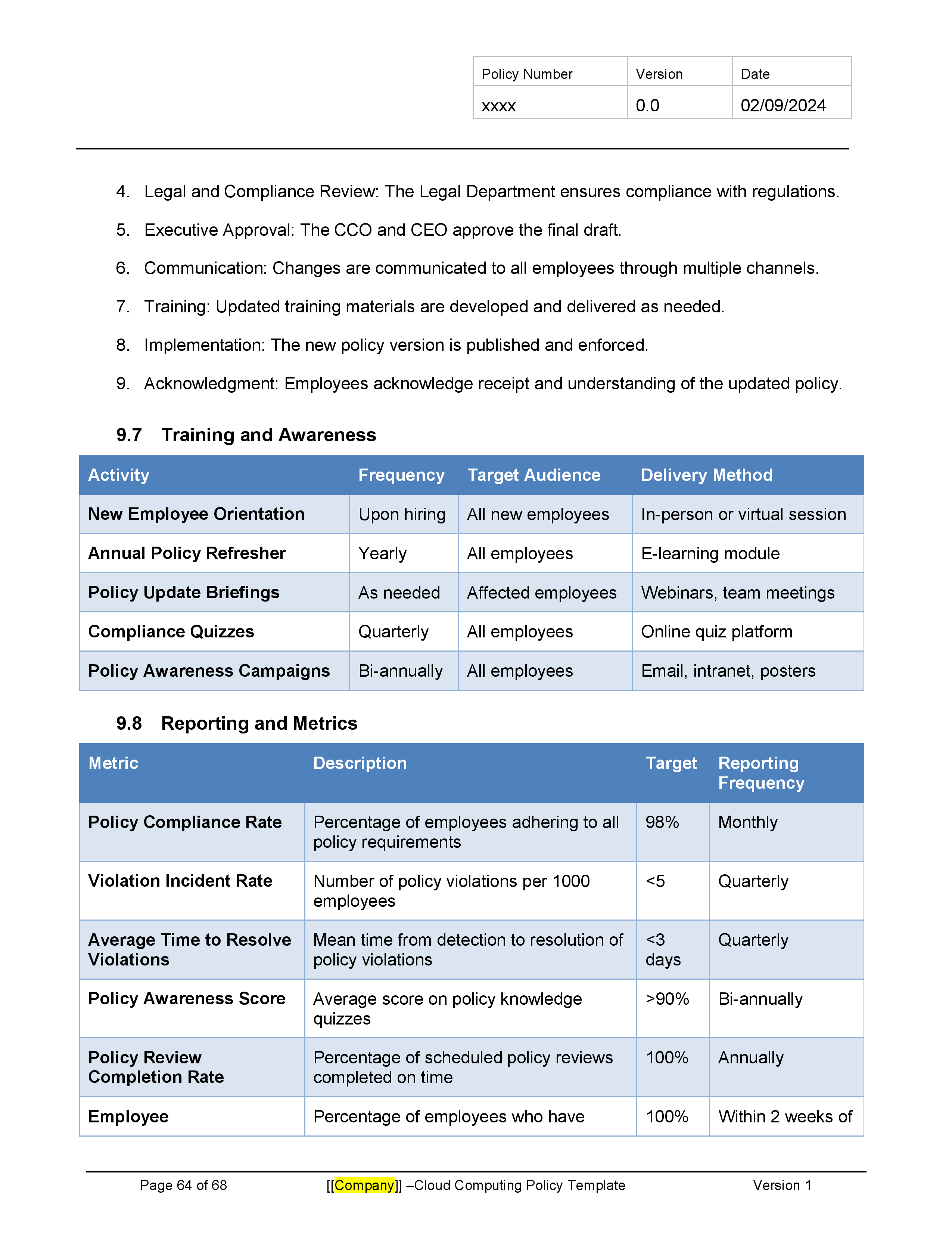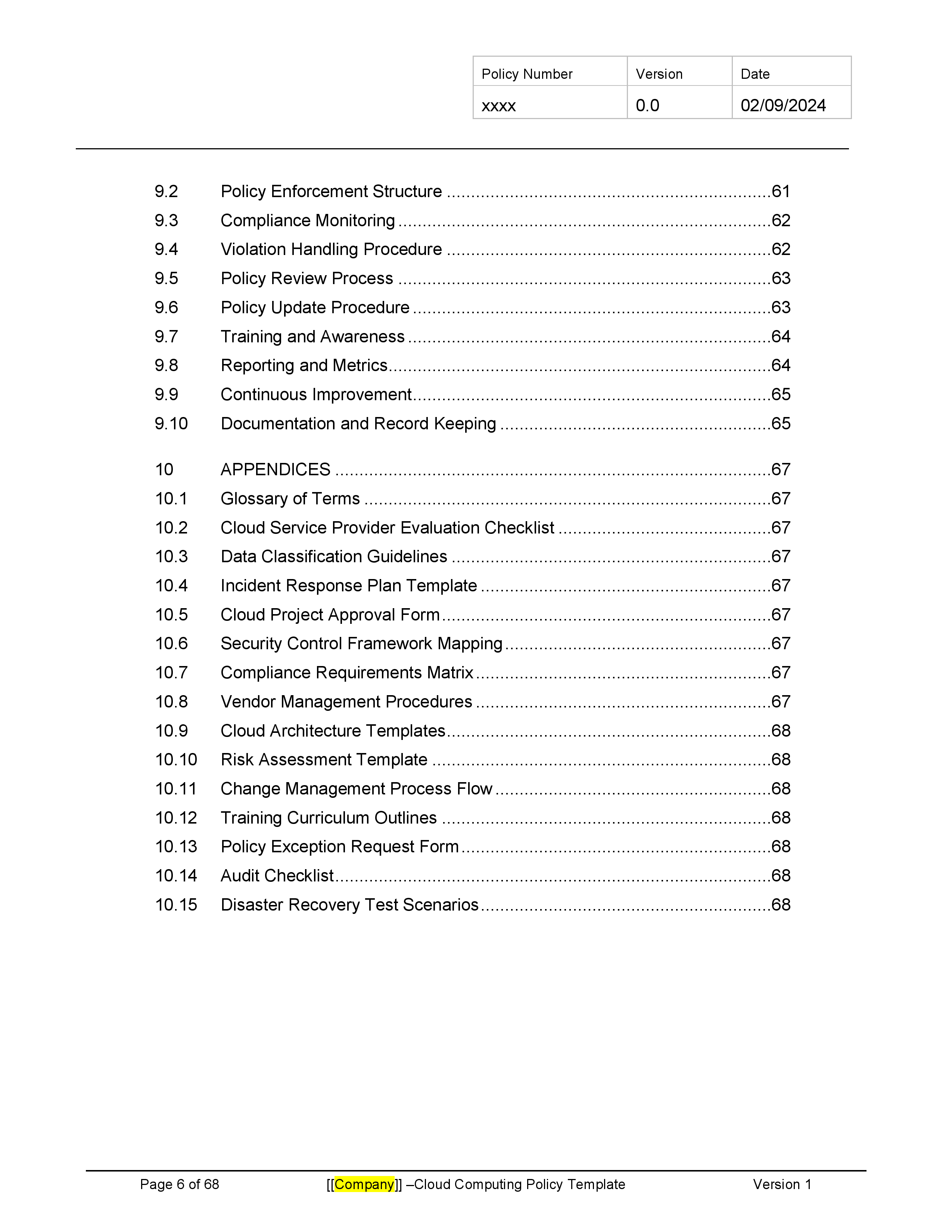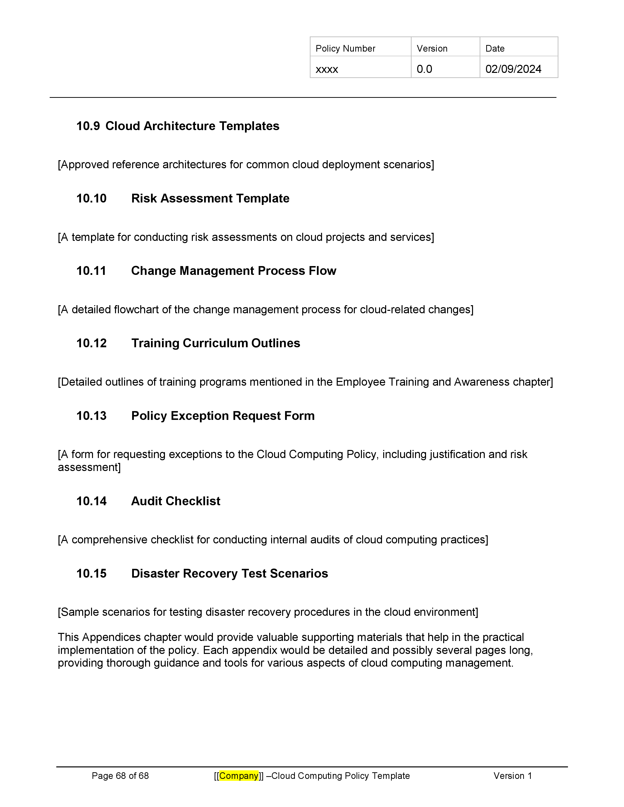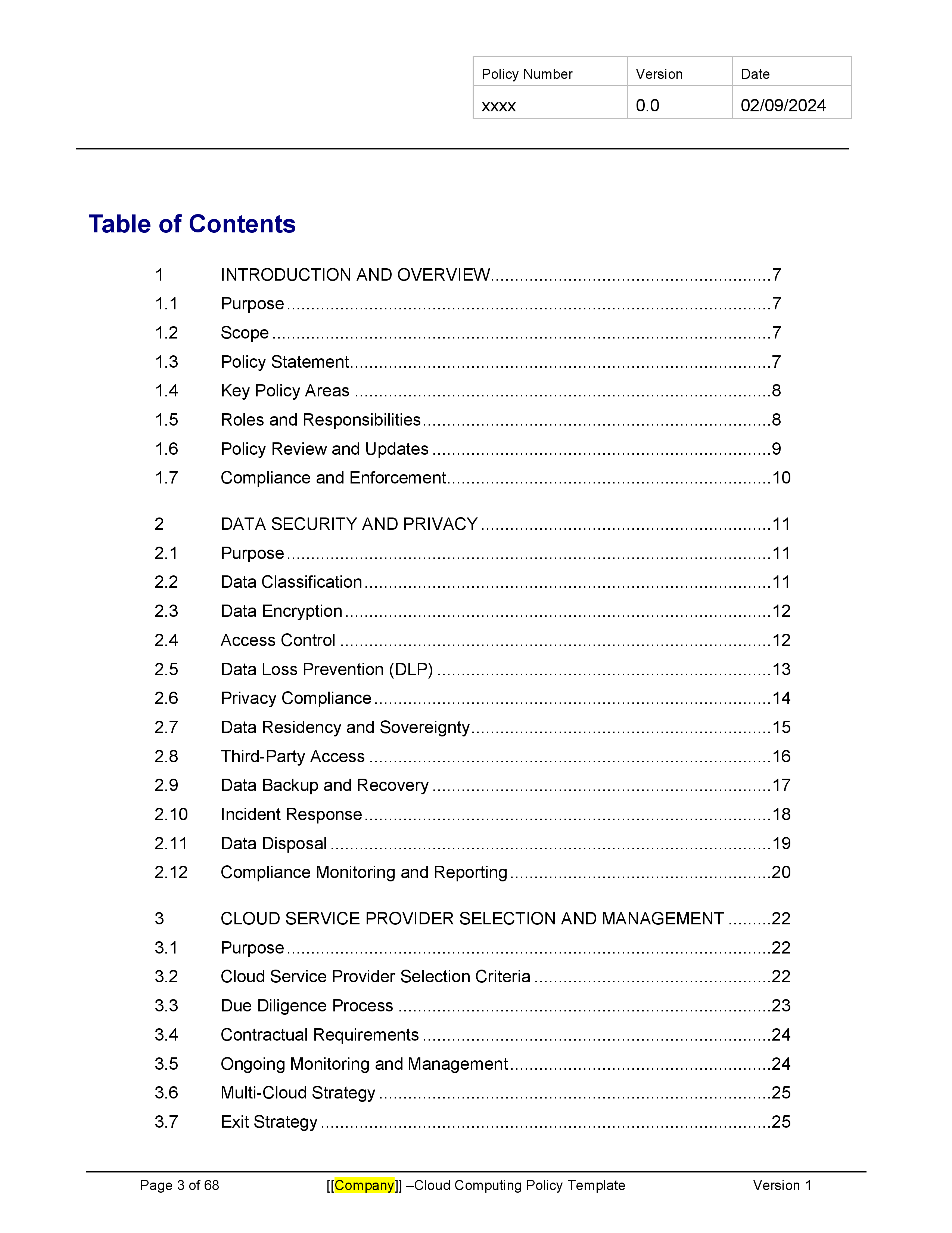 The policy template covers a wide range of topics related to cloud computing, including data security, access control, data backup and recovery, and compliance with regulatory requirements. It also includes detailed instructions on how to implement these policies and procedures, as well as guidelines for monitoring and auditing cloud computing operations.