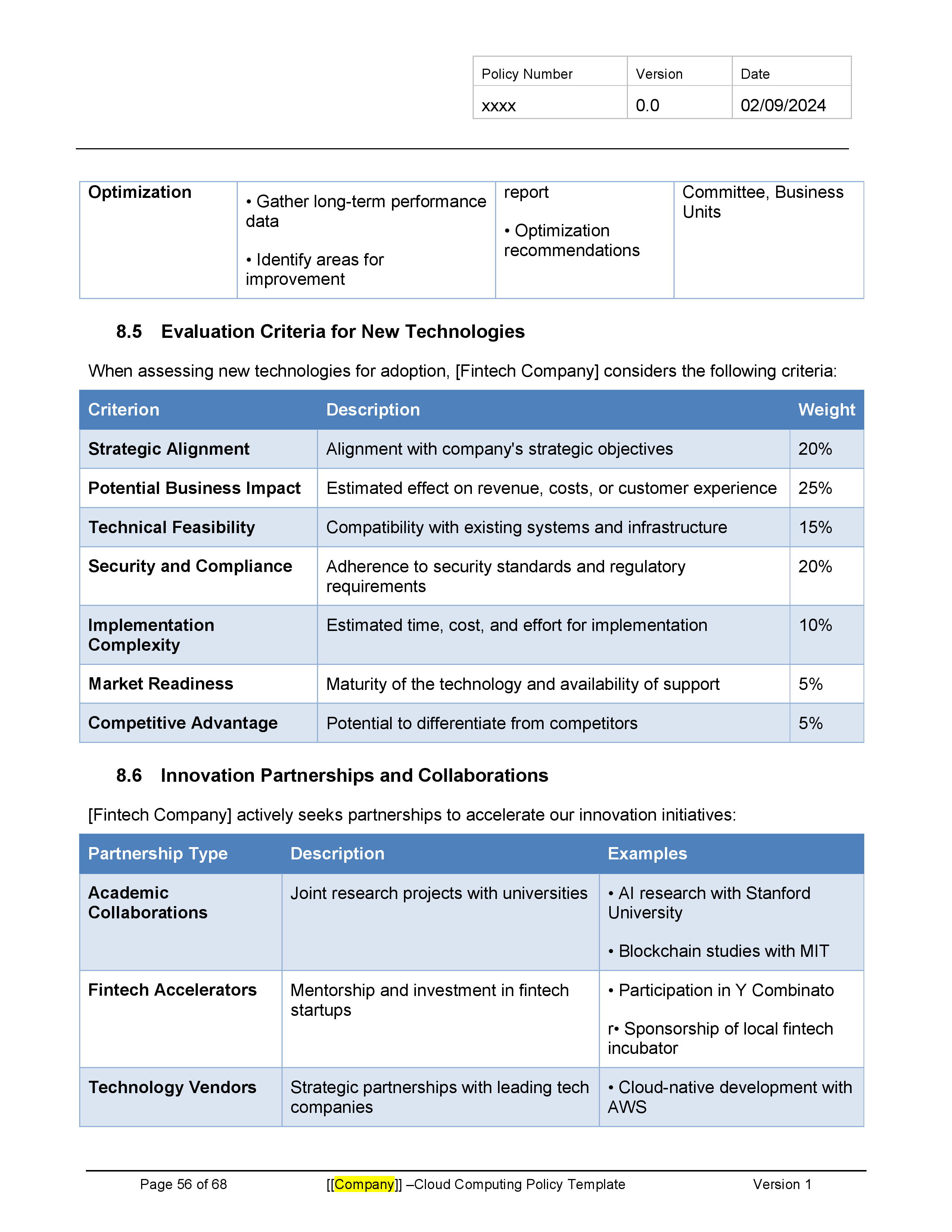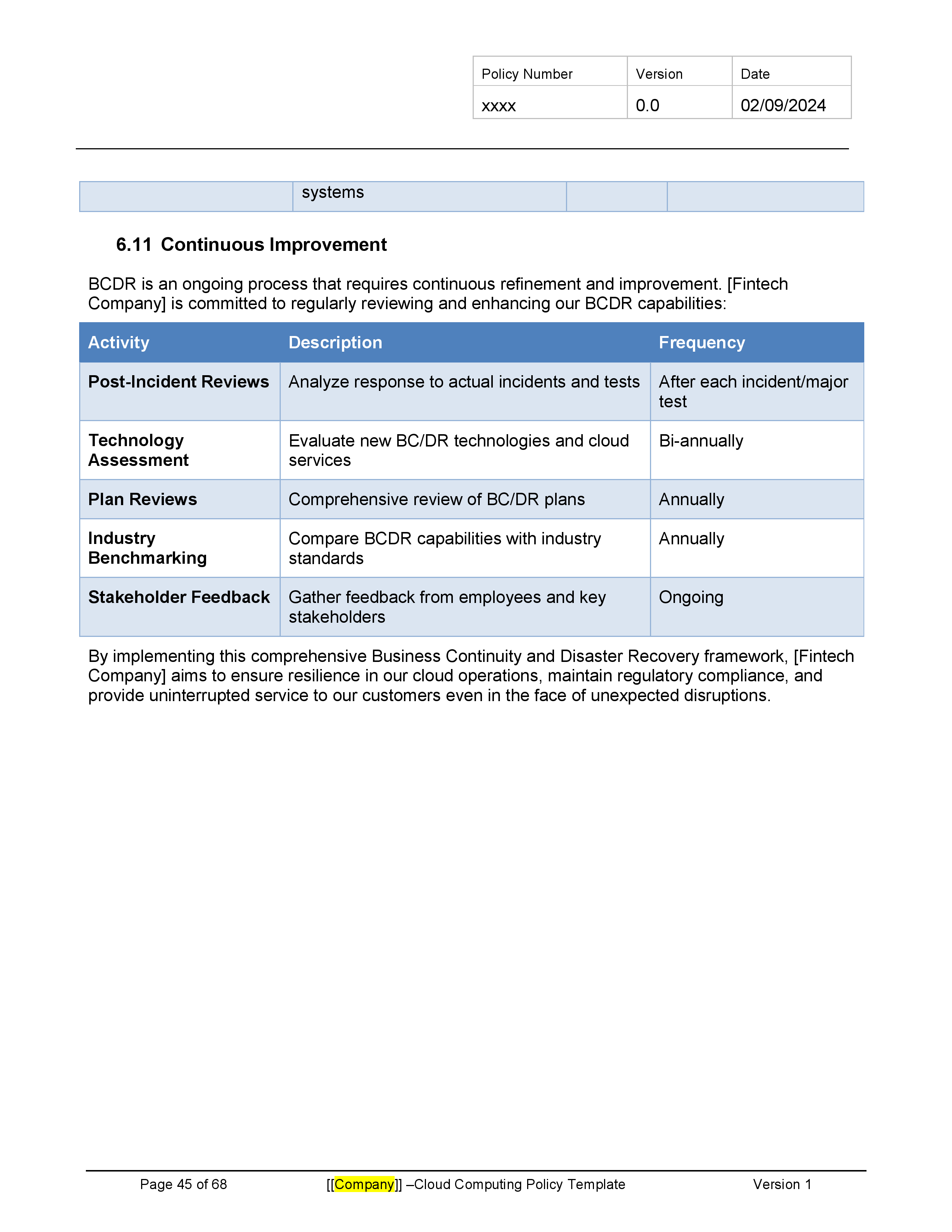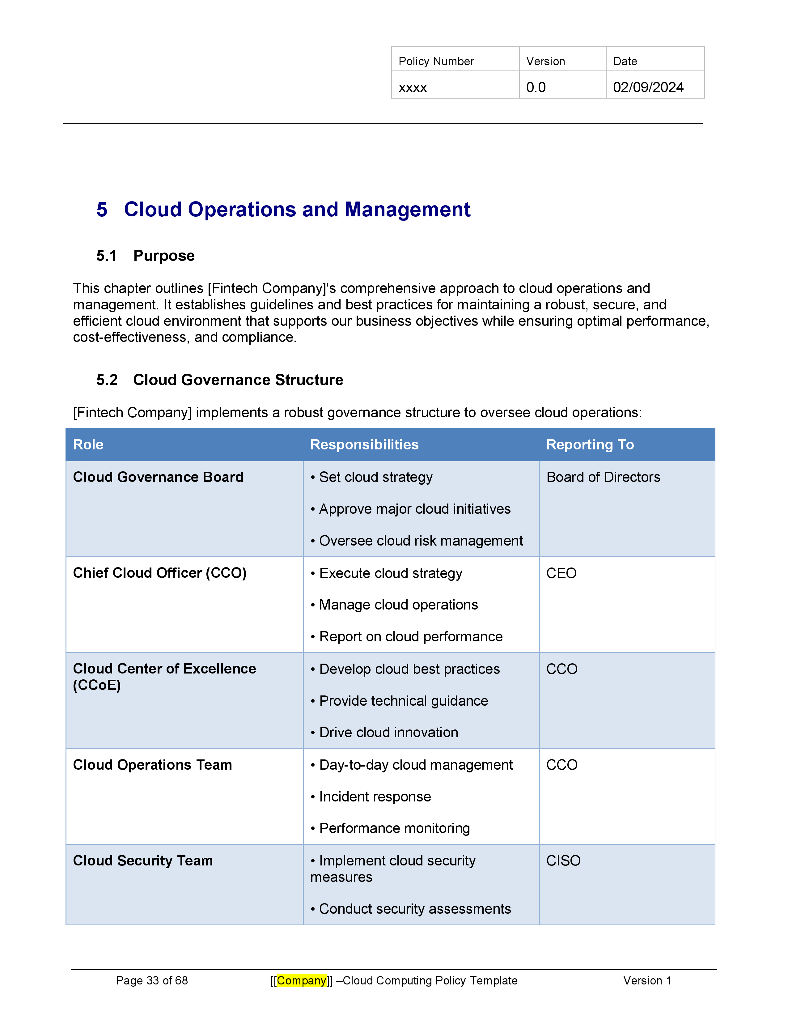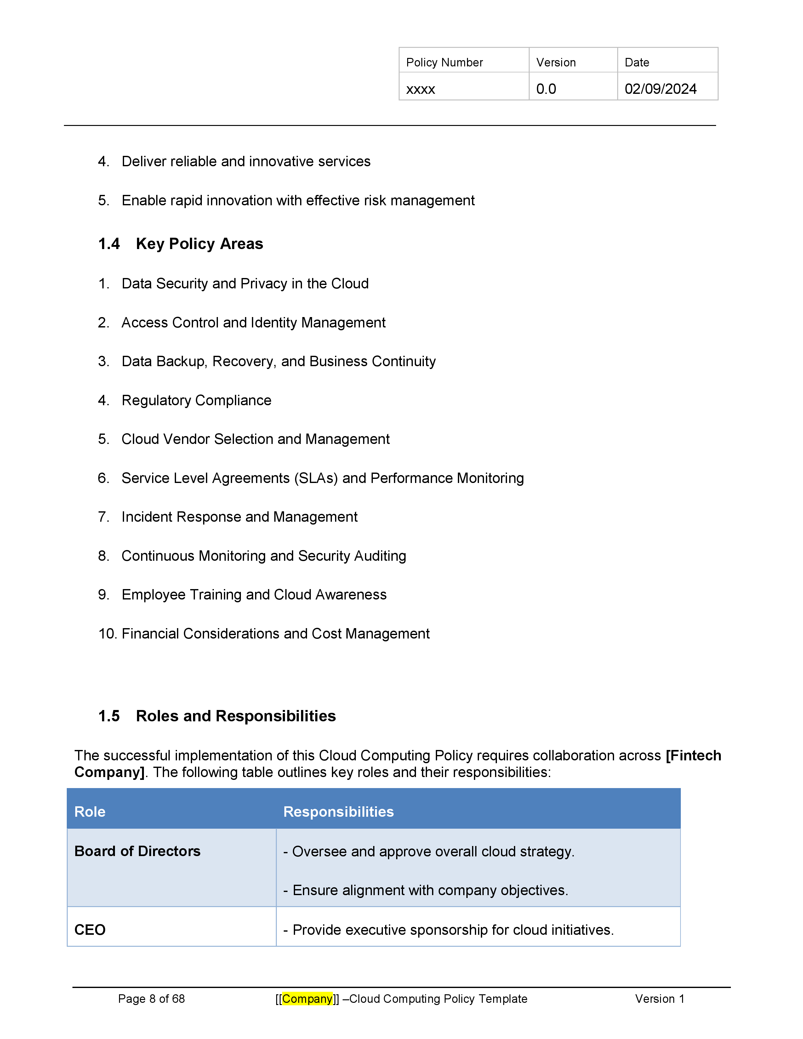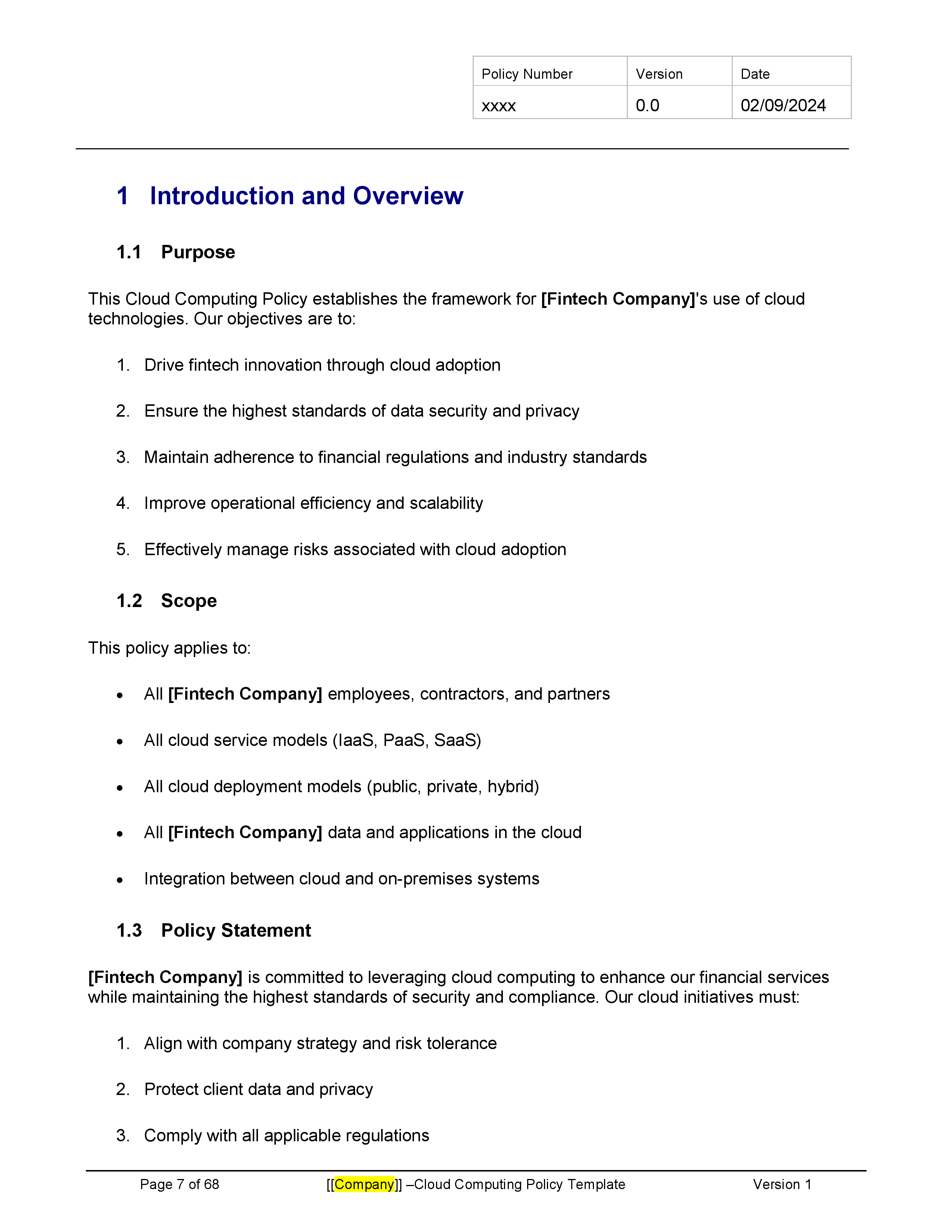 Overall, the Cloud Computing Policy template is an essential tool for any aspiring fintech company that is looking to leverage the benefits of cloud computing. By providing a comprehensive set of guidelines and best practices, this policy template can help fintech companies ensure that their cloud computing operations are secure, reliable, and compliant with industry standards.