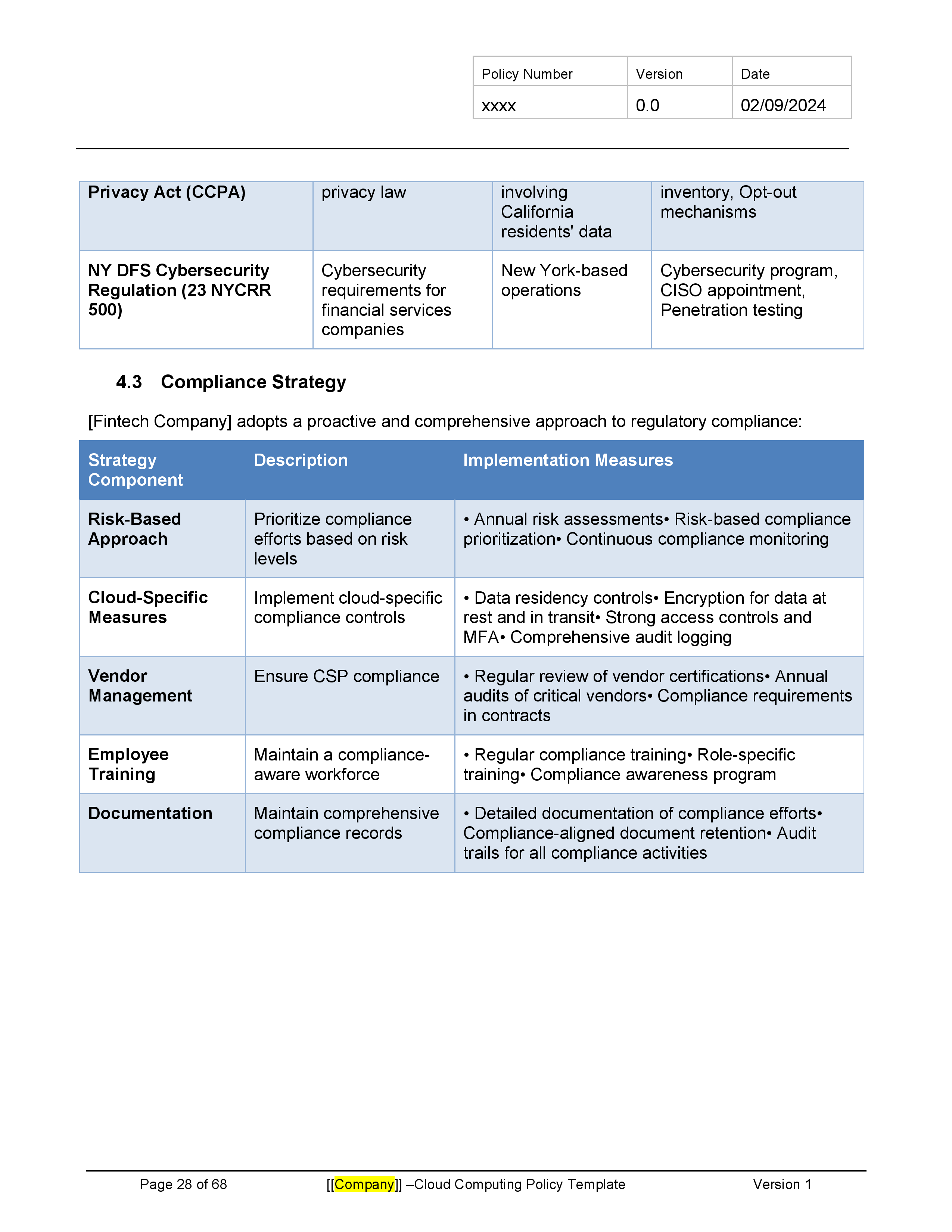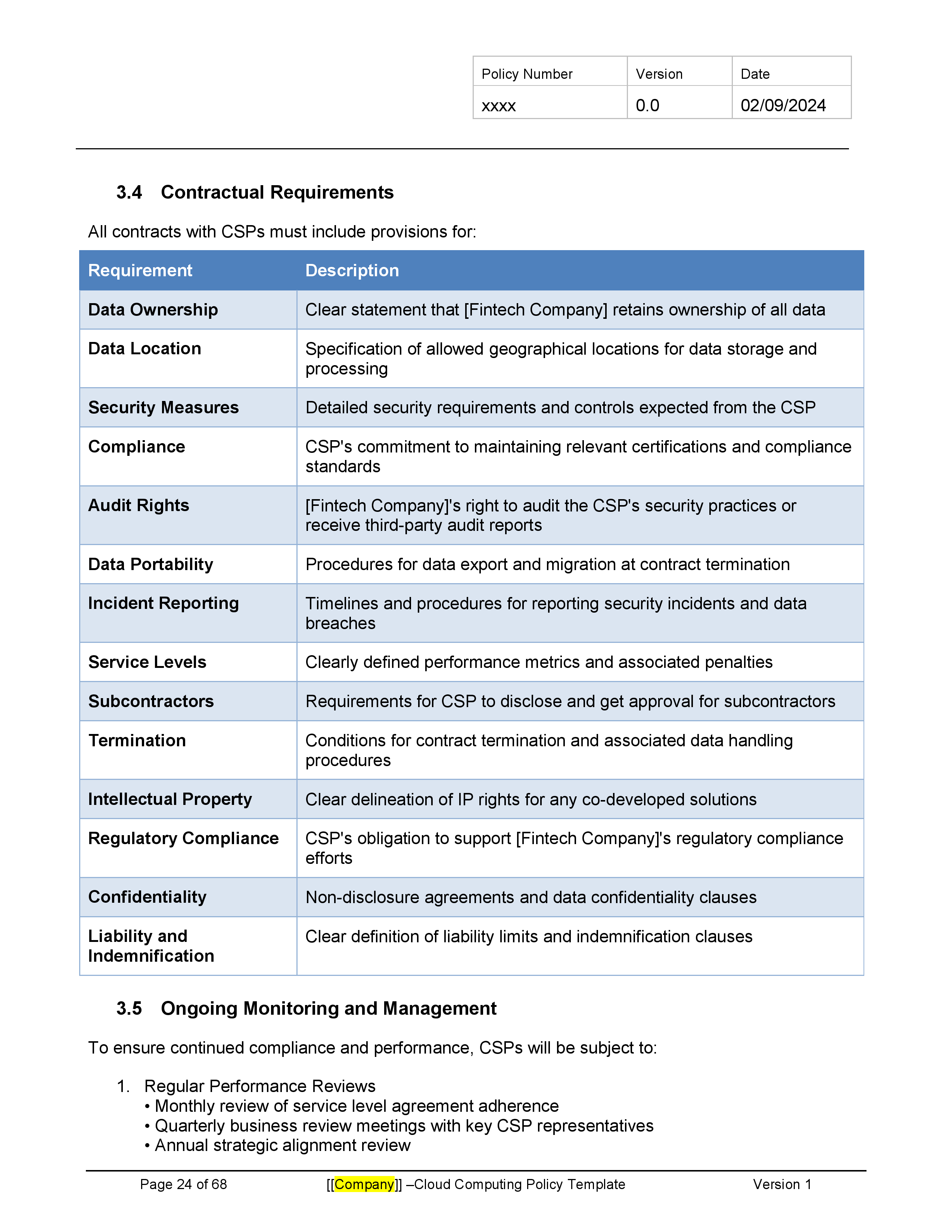 The Cloud Computing Policy template is specifically designed for aspiring fintech companies that are looking to leverage the benefits of cloud computing. This policy template provides a comprehensive set of guidelines and best practices that fintech companies can use to ensure that their cloud computing operations are secure, reliable, and compliant with industry standards.