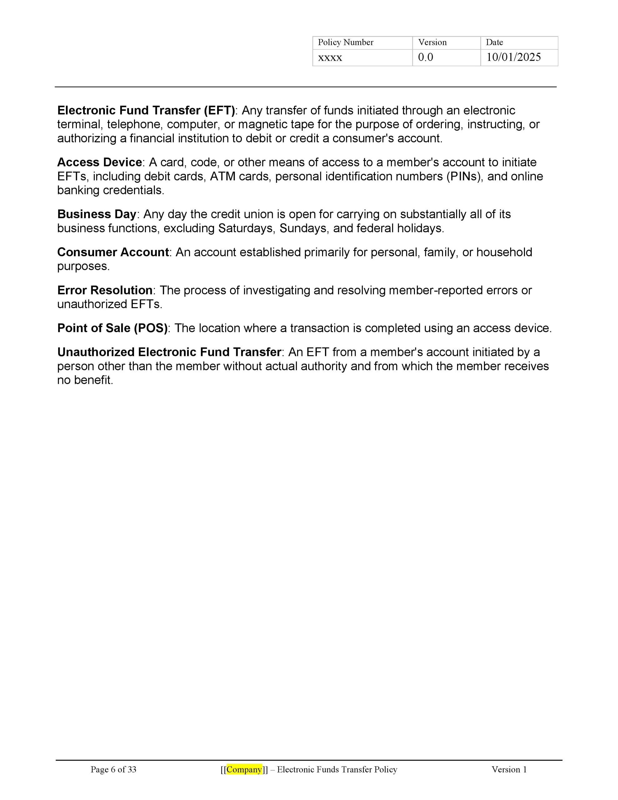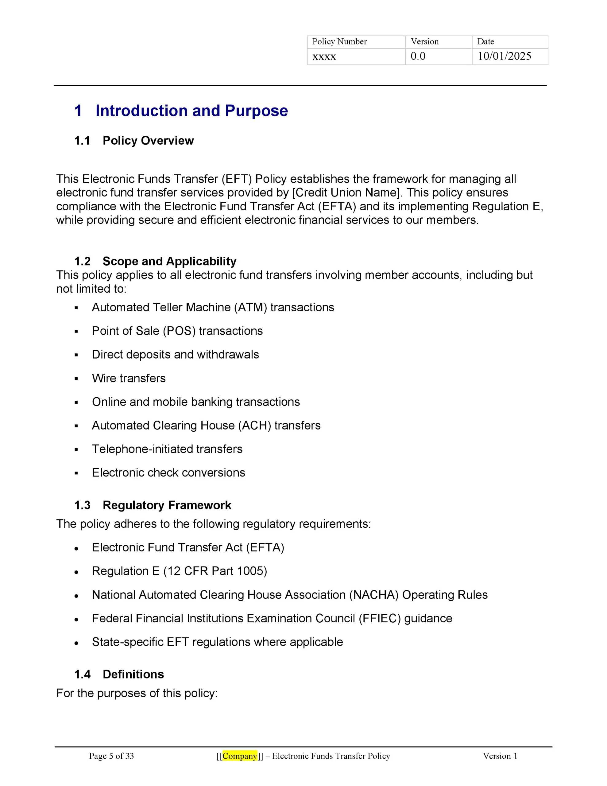 By implementing this comprehensive EFT policy, credit unions can ensure regulatory compliance, protect member interests, and maintain the security and integrity of their electronic fund transfer services. This template serves as a valuable resource for credit unions of all sizes, providing a solid foundation for managing EFT operations effectively and responsibly.