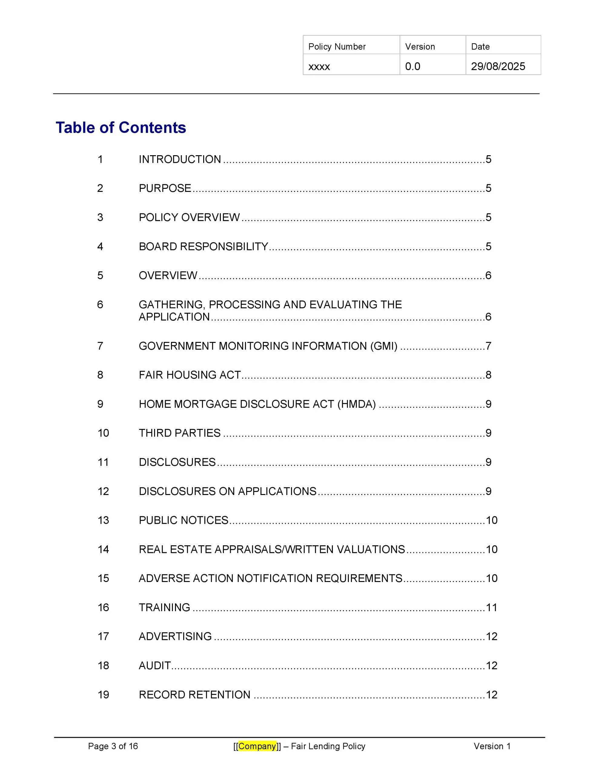 This customizable template allows you to tailor the policy to your credit union’s specific needs while ensuring adherence to regulatory requirements. It includes placeholders for institution-specific information and offers flexibility to incorporate your unique lending products and services.