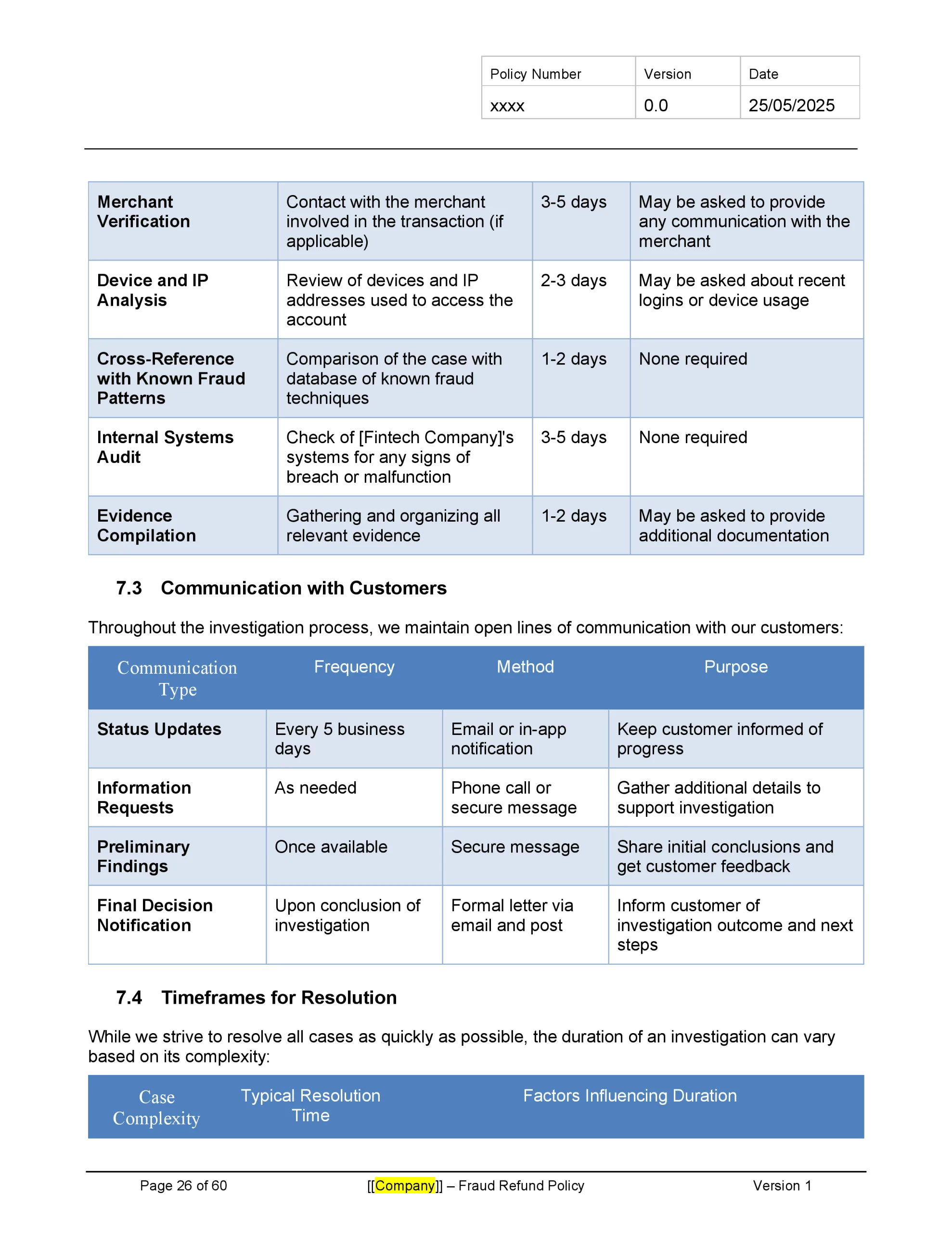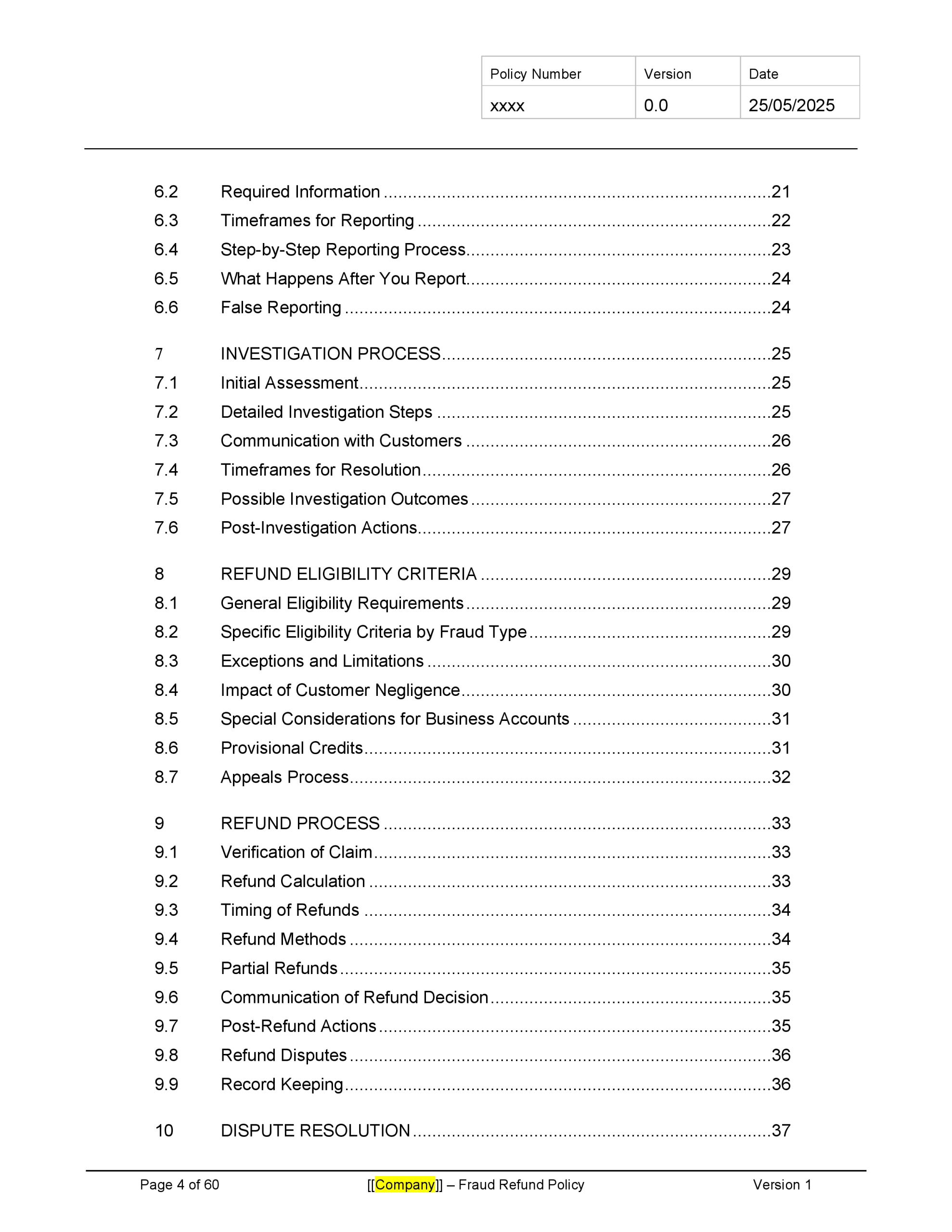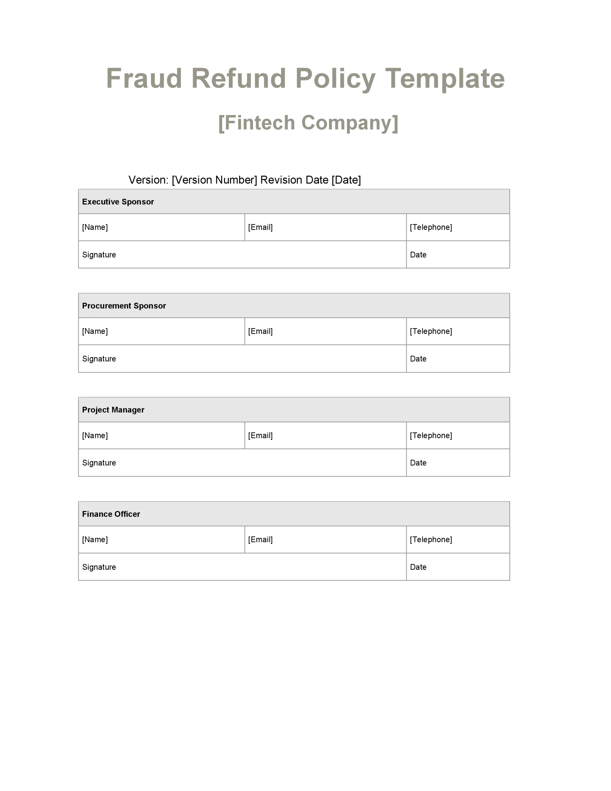 Customizable to fit your company’s specific risk profile and regulatory environment, this template provides a solid foundation for creating a comprehensive fraud refund policy that enhances customer trust while protecting the company from undue risk. Download now to strengthen your fintech’s approach to fraud management and demonstrate your commitment to customer protection.