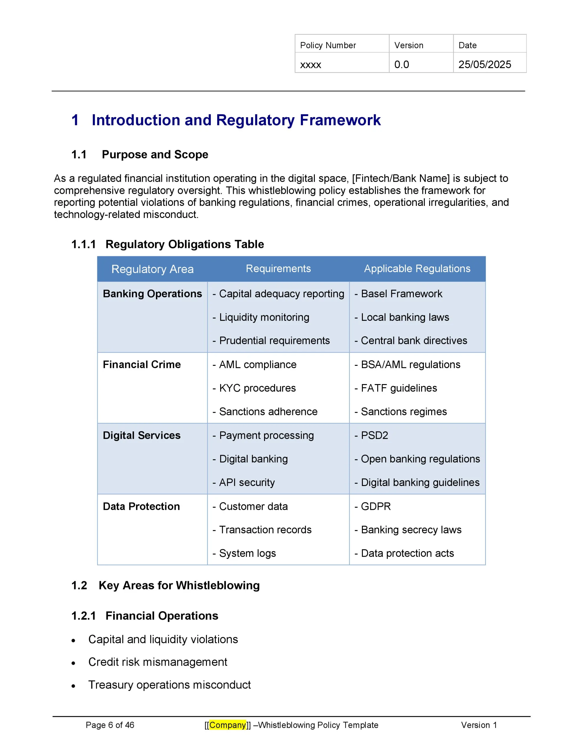 The whistleblower policy template is specifically designed for aspiring fintech companies to ensure that their employees feel comfortable reporting any unethical or illegal behavior within the organization. This policy is crucial for maintaining a transparent and ethical work environment, which is essential for building trust with customers and investors.