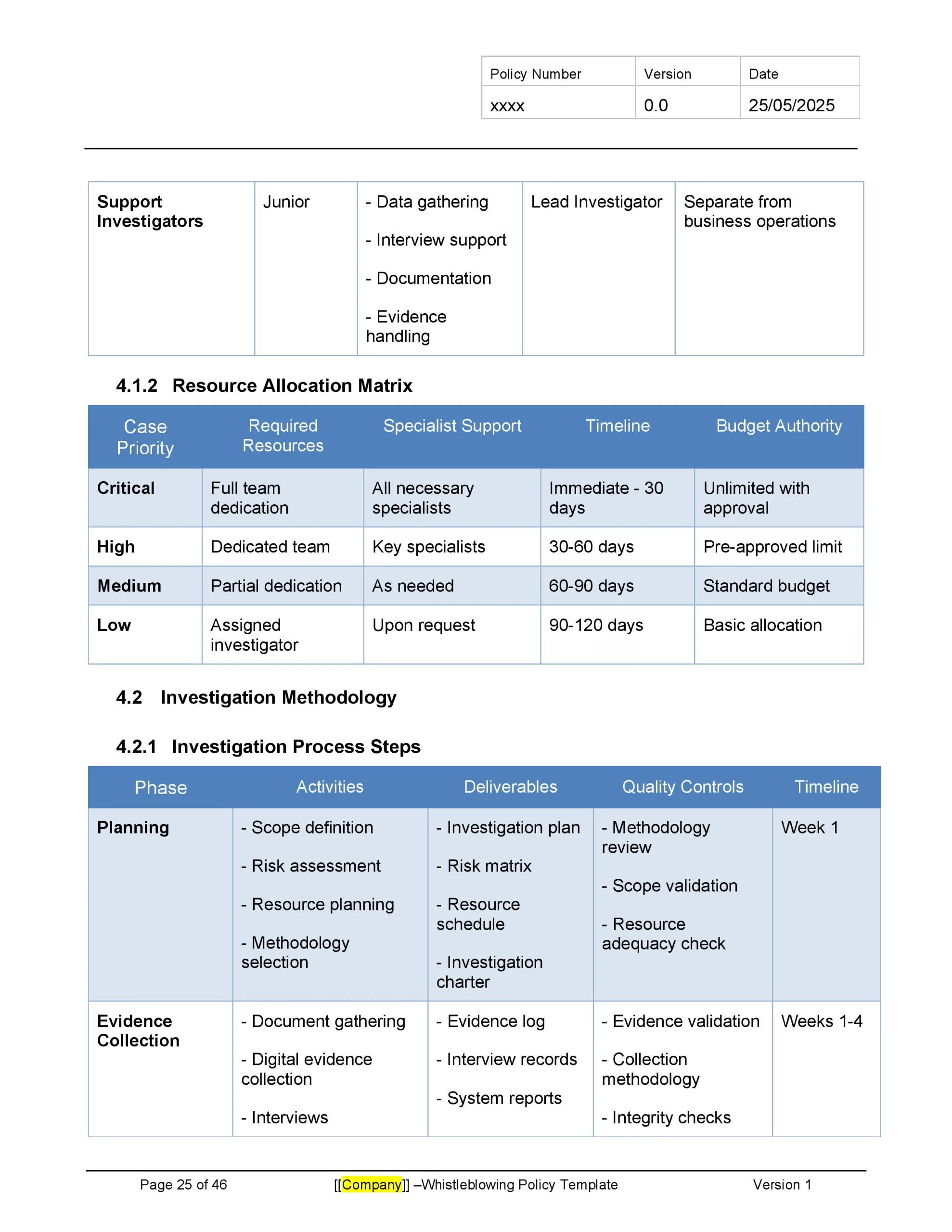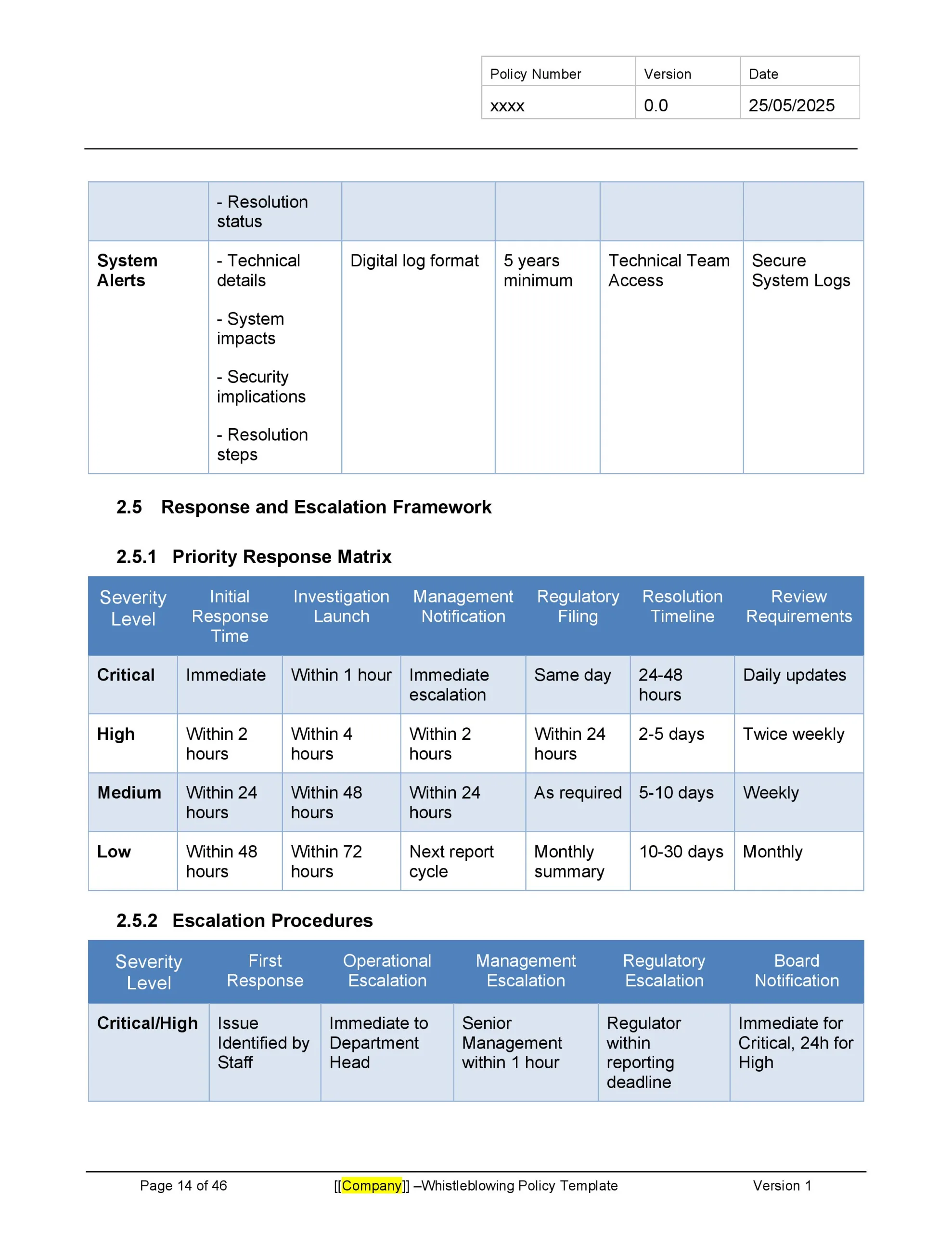 The policy also includes guidelines for reporting concerns to external regulatory bodies, such as the Securities and Exchange Commission (SEC) or the Financial Industry Regulatory Authority (FINRA). This ensures that the company is compliant with all relevant regulations and that employees are aware of their rights and responsibilities when reporting concerns.